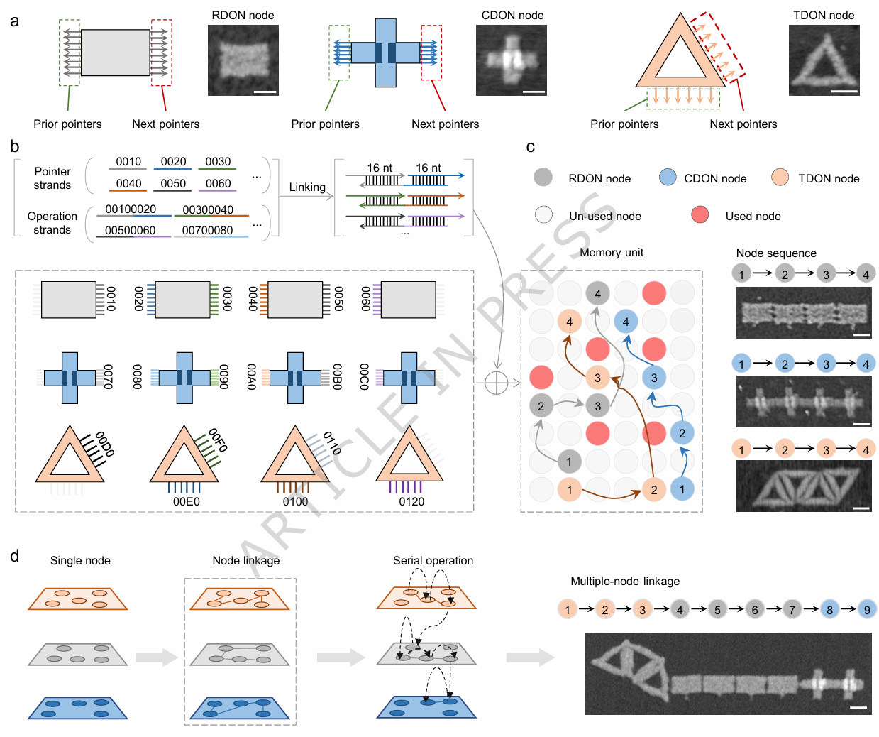 科研团队借鉴计算机链表存储架构,设计了三种具有特定形状的DNA折纸纳米结构(DONs)作为存储节点,其中三角形(TDON)、矩形(RDON)和十字形(CDON),分别承担不同类型数据的存储任务。每个节点集成了数据域和指针域:数据域通过链霉亲和素与生物素修饰的数据链结合,以二进制形式编码信息;指针域则由边缘特定序列的DNA链构成,通过与可分离的“指令链”互补配对,实现节点间的精准连接与断开。这种设计巧妙借鉴了计算机科学中的链式数据存储思想,无需连续的存储单元,可根据数据大小动态分配空间,避免了传统存储中数据修改时的大规模迁移。
