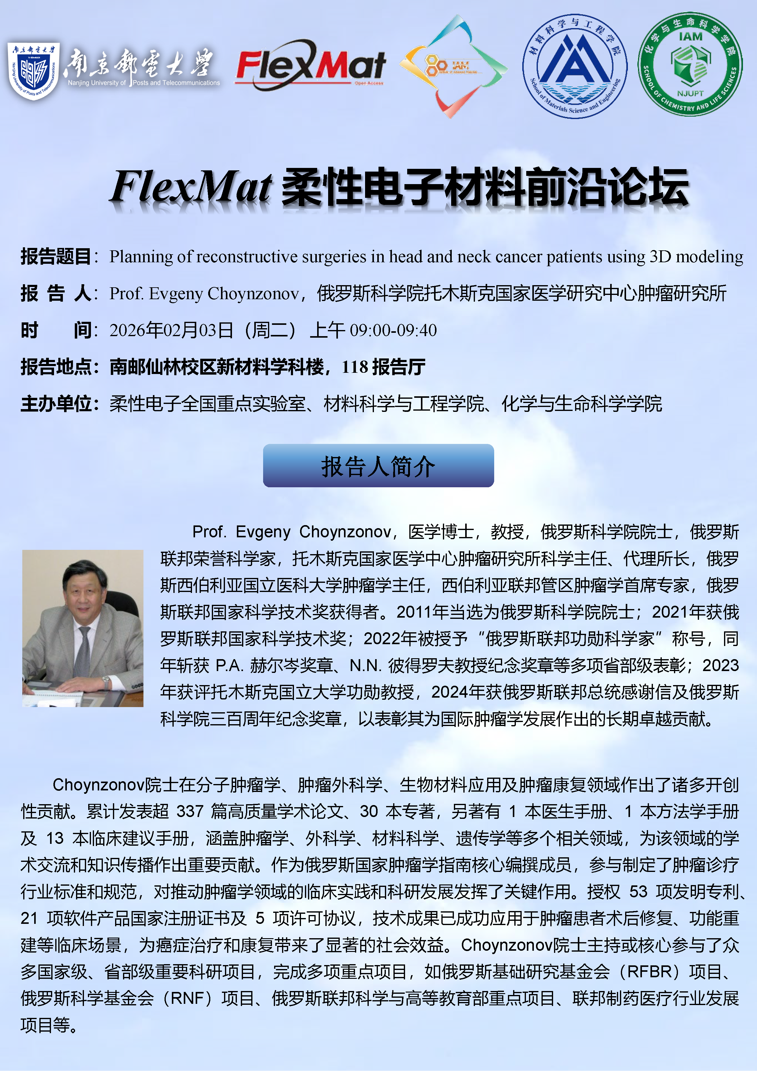 FlexMat柔性电子材料前沿论坛:俄罗斯科学院托木斯克国家医学研究中心肿瘤研究所Evgeny Choynzonov院士